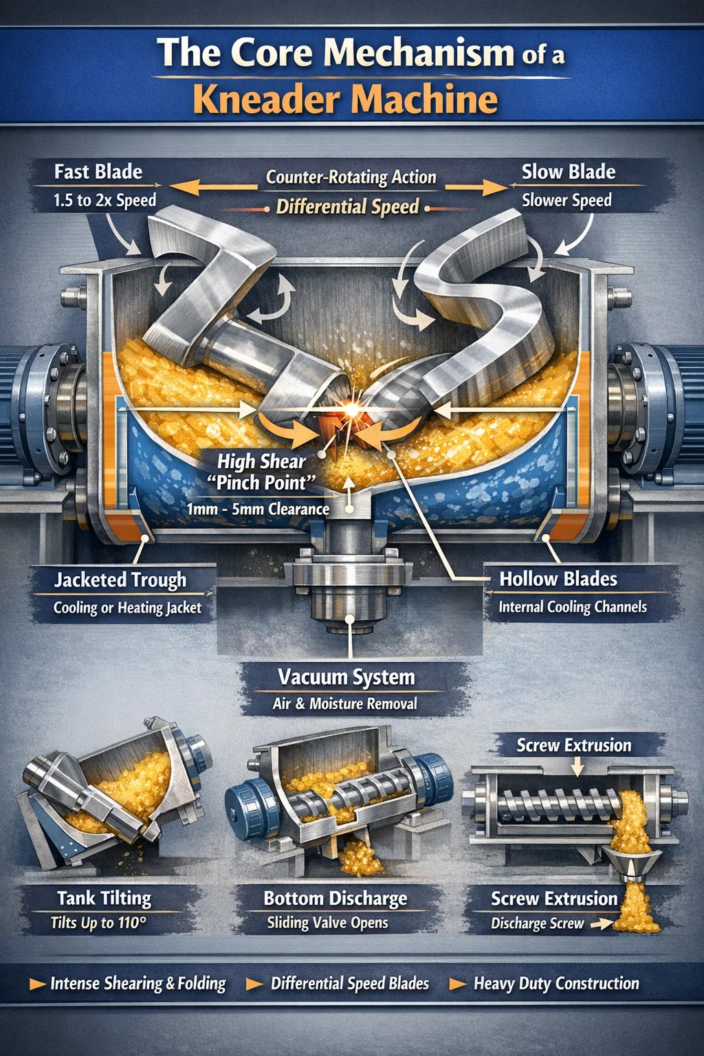 EEN kneedmachine werkt door gebruik te maken van een paar tegengesteld draaiende bladen (meestal Z-vormige of Sigma-bladen) die op verschillende snelheden werken in een W-vormige trog. Het primaire doel is om materialen met een hoge viscositeit of halfvaste materialen te onderwerpen intens knippen, vouwen en compressie . In tegenstelling tot standaardmixers die alleen maar materiaal verplaatsen, perst een kneder de substantie door smalle openingen tussen de messen en de wanden van de trog, waardoor een homogeen mengsel van ingrediënten wordt gegarandeerd die anders bestand zijn tegen stroming.