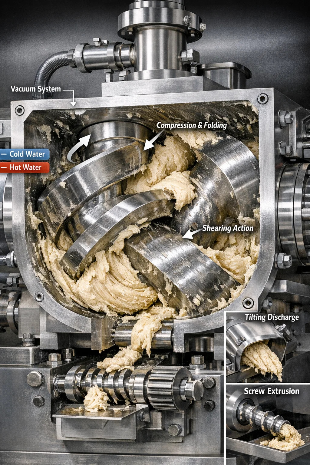 EEN kneder werkt volgens hetzelfde principe als thuis deeg kneden, maar maakt gebruik van enorme mechanische kracht en geavanceerde metalen structuren. Het is niet alleen maar eenvoudig 'roeren', maar verwerkt extreem stroperige materialen die gewone lepels niet aankunnen door herhaaldelijk 'kneden, knijpen, trekken en scheuren'.