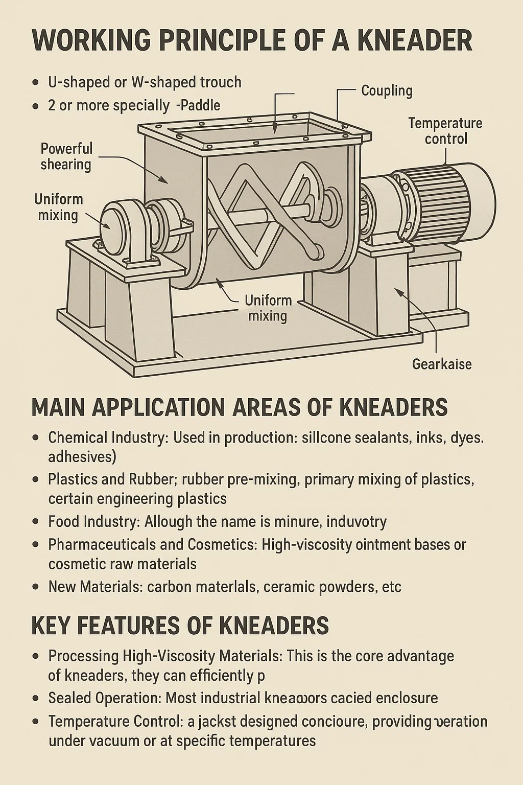 Een kneder, ook wel mixer of deegmixer genoemd, is een industrieel apparaat dat voornamelijk wordt gebruikt voor het krachtig mengen, kneden en roeren van materialen om een uniforme, plastische toestand te bereiken. Je kunt je hem voorstellen als een superkrachtige mengkom, maar in plaats van alledaagse ingrediënten verwerkt hij verschillende stroperige, halfvaste of hoogviskeuze materialen die bij industriële productie een hoge mengintensiteit vereisen.