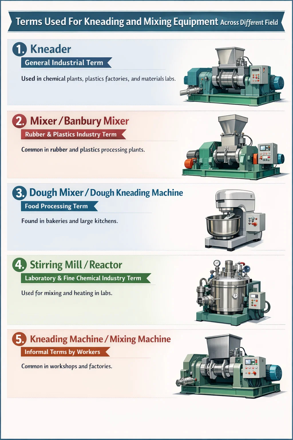 Wat apparatuur als ‘kneedmachines’ of ‘deegmixers’ betreft, variëren de namen die ervoor worden gebruikt sterk per vakgebied en bedrijfstak. Hoewel hun kernfunctie het mengen van materialen is door middel van krachtig kneden, verschillen de namen die mensen gebruiken aanzienlijk, afhankelijk van de toepassing.
