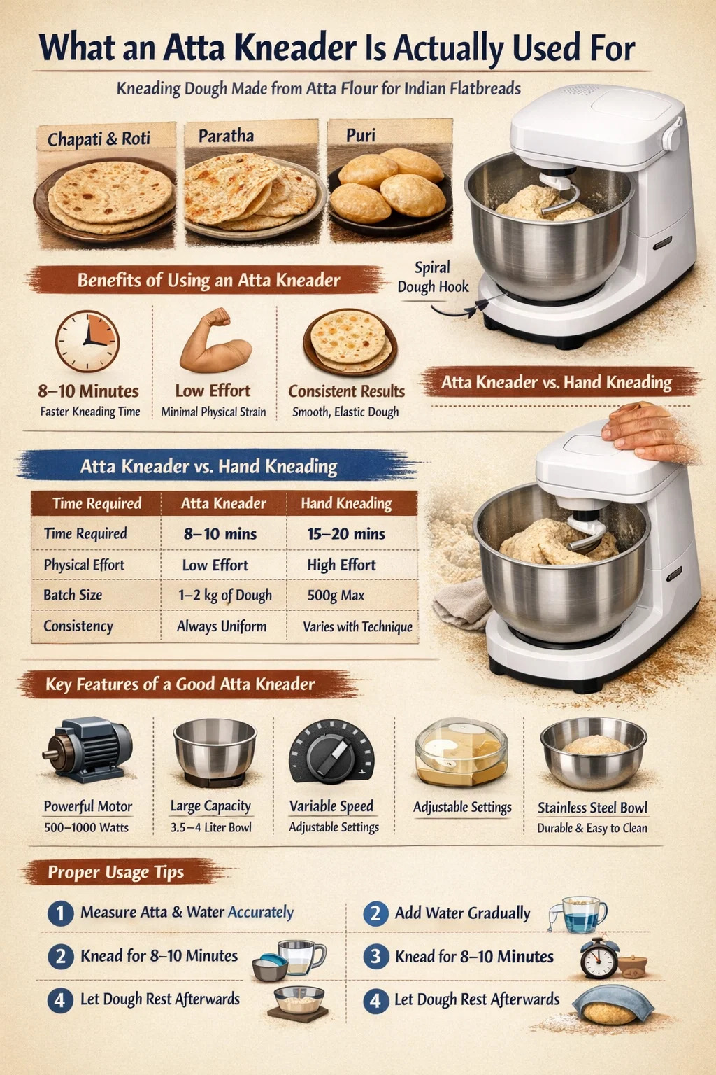 De term "atta-kneder" wordt zowel gebruikt voor zelfstandige aanrechtmachines die speciaal voor dit doel zijn gebouwd, als voor deegkneedhulpstukken die op keukenmixers passen. Beide werken volgens hetzelfde mechanische principe, hoewel zelfstandige eenheden vaak specifiek zijn geoptimaliseerd voor de viscositeit en dichtheid van volkoren atta-deeg.